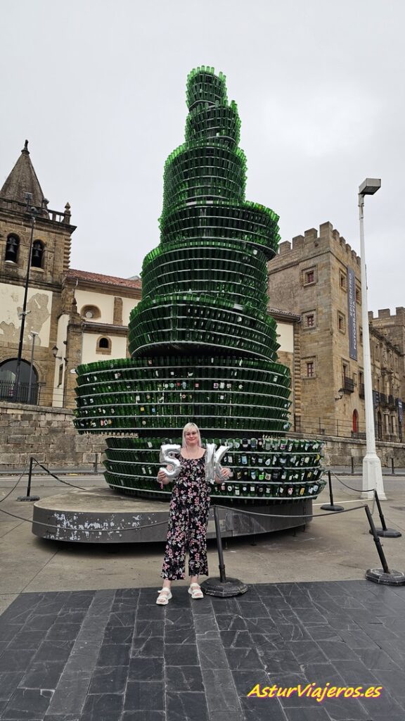 Está construido con miles de botellas verdes recicladas y representa el espíritu asturiano: ecológico, festivo y unido a su bebida más emblemática.