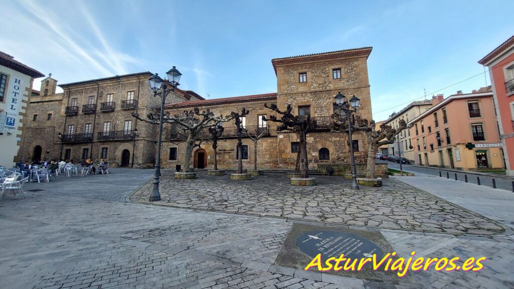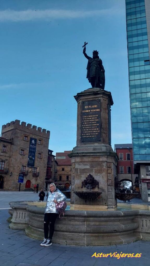 En el centro de la plaza se alza la estatua de Don Pelayo, primer rey de Asturias, que mira desafiante hacia el mar. A su alrededor, tres joyas arquitectónicas dominan la escena: